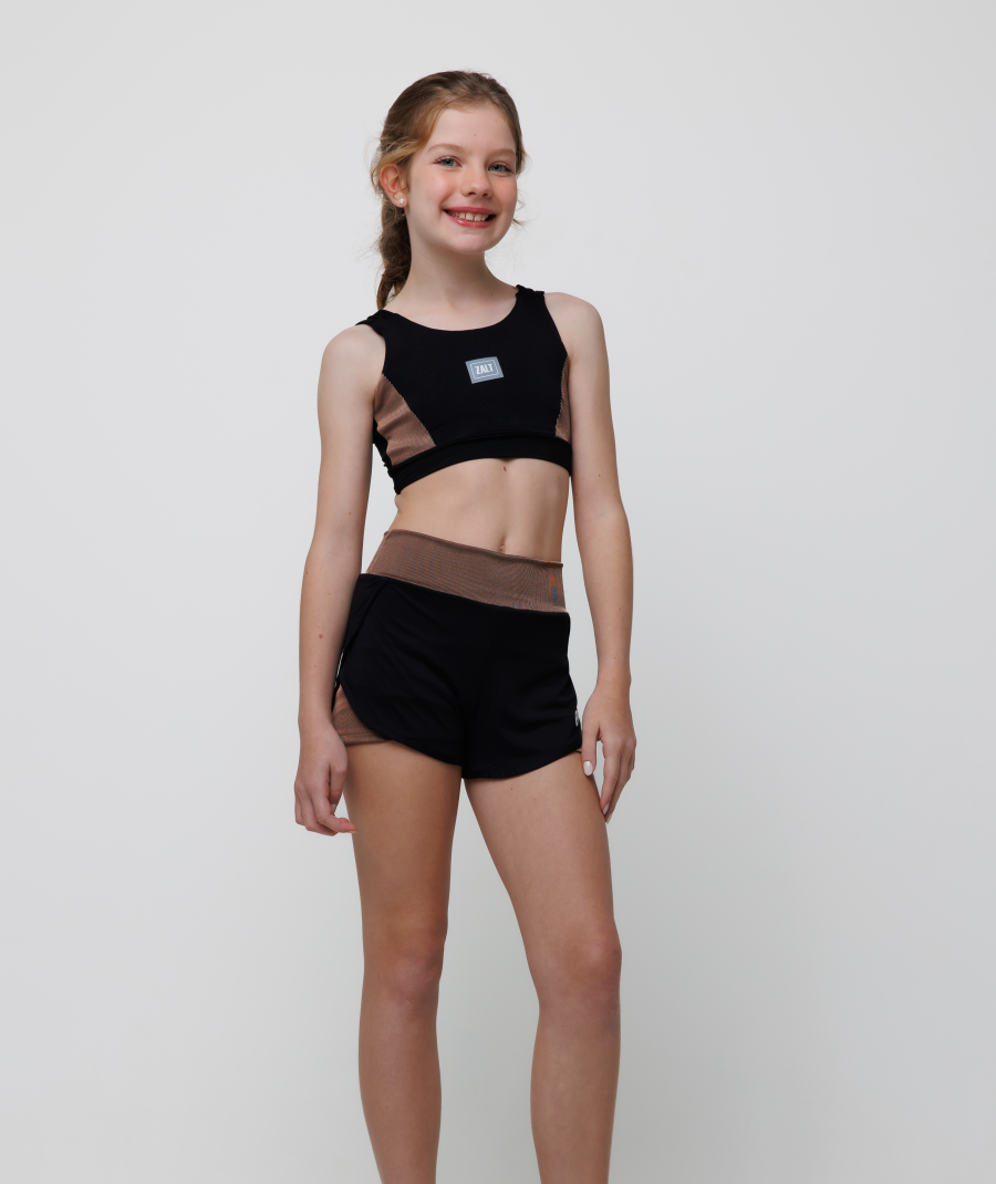 O top Mia é um modelo que conta com recortes nas Possui dois tipos de tecidos, sendo um deles com estrutura mini canelada que apresenta um leve brilho. Esse modelo se ajusta super bem ao corpo, ideal para usar com os shorts Mia, que compõem essa coleção. |